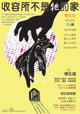 台大懷生社今年以「收容所不是牠的家」為主題的懷生週順利落幕了!從3/10、3/11杜鵑節開始,接續一個禮拜的時間,同學在校園內擺攤、舉辦義賣活動,所得將用於幫助流浪動物結紮與醫療。