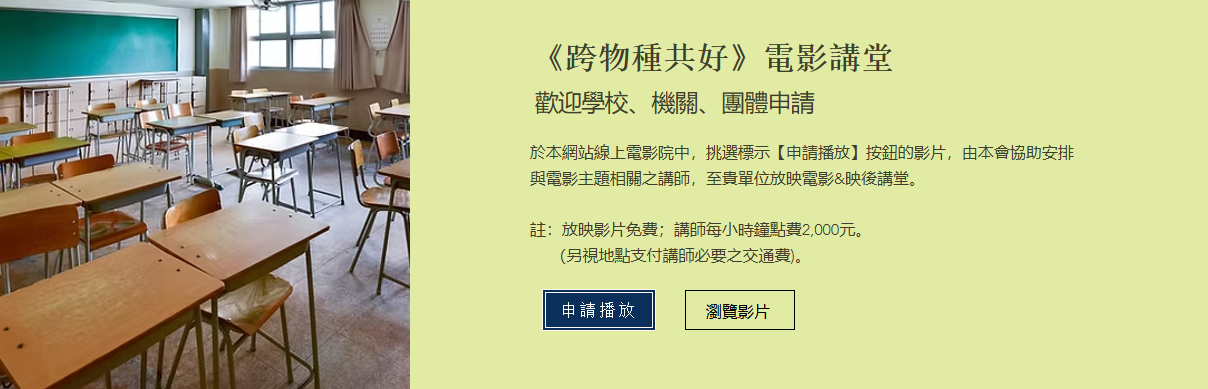 關懷生命協會《跨物種共好影展》蒐整37部動物影片,目前實體放映會已全數結束。歡迎透過其他兩種方式「線上電影院」及「《跨物種共好》電影講堂」進行觀影。