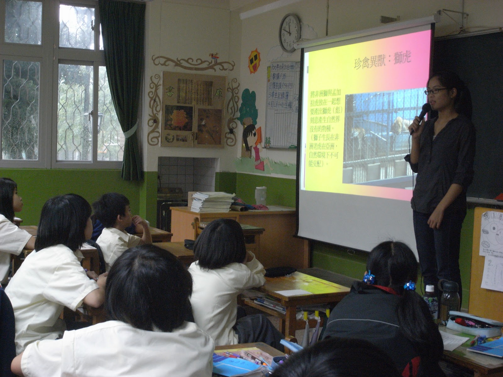 於是在進入正題前我先請同學想想自己對於「生命」,不管是自己的還是朋友家人的生命,有什麼樣的感覺,然後想出三個形容詞來形容它。從各式各樣的回答中可以一窺現在國中生的生命觀:有人說他覺得生命是「重要的、珍貴的、獨特的」;也有人用生物學的觀點回答,生命是「有呼吸的、會生病的、會死亡的」;還有人說生命是「不太快樂的」;我則是依照動物權利的立場,提出英國哲學家邊沁的想法:生命是「能感受痛苦的」。藉由思考這個問題,多數同學發現其實生命並不只限於人類或寵物,其他的非人類動物同樣也是生命。此時大家漸漸進入狀況,觀看本土動物表演的影片時也聚精會神的欣賞,雖然播放到小豬游泳的時候偶爾會聽到一兩聲「哈哈!」或是「好可愛!」,但隨著動物刻板行為的出現,同學們的表情漸漸轉為嚴肅,我相信他們已經開始思考一些問題了。