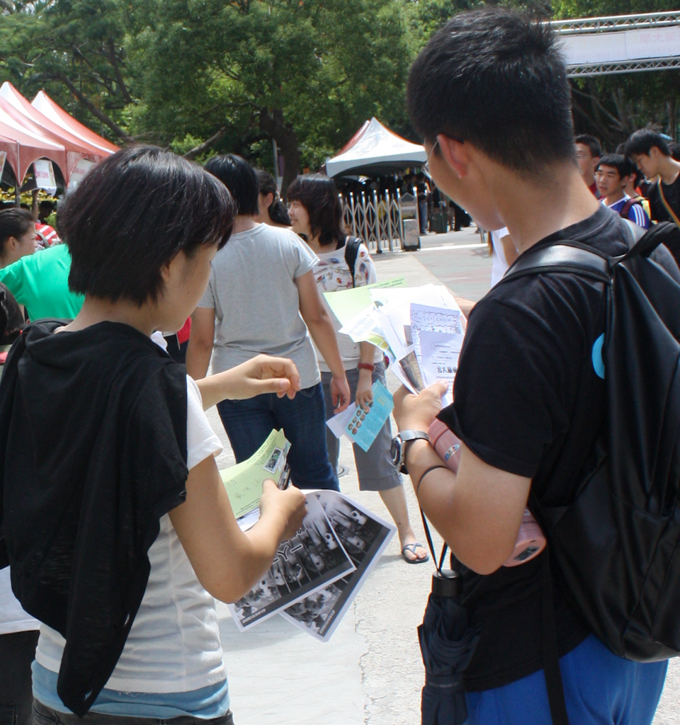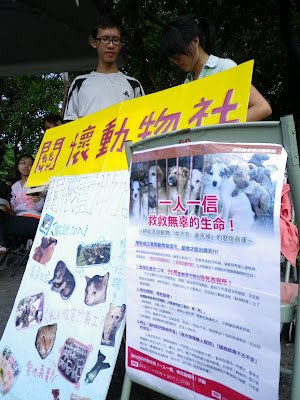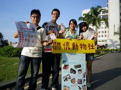九月十一日(週日)的早上十點到下午五點是台大的社團聯展,為了應映最近「一人一信,催生動保司」的活動,台大懷生社社員一手拿著懷生社的文宣,另一手拿著催生動保司的明信片和傳單呼籲大家共同支持這項活動。