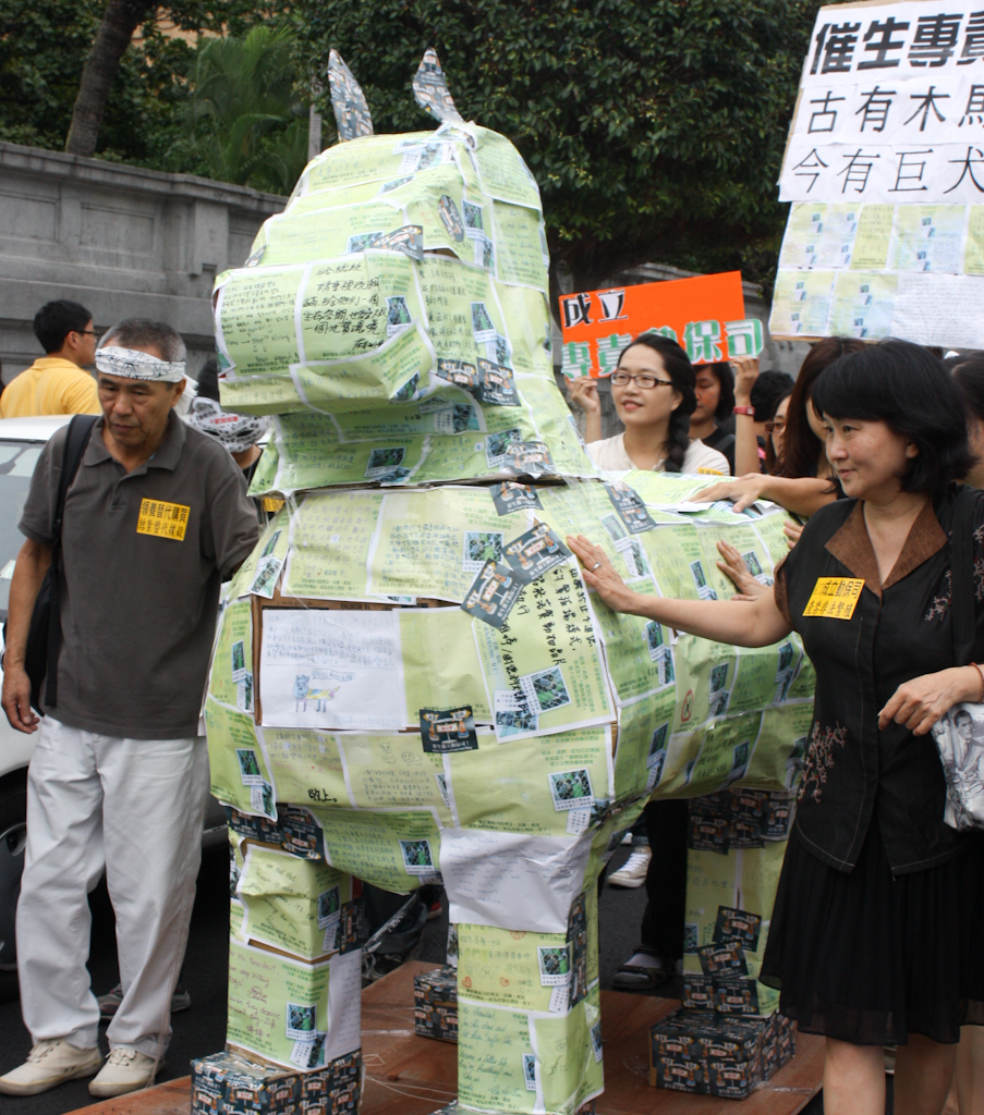 催生動保司行動聯盟於10月14日下午發起「苦爬送信給馬總統」活動,號召百餘名愛護動物的社會大眾以「苦爬」的方式為動物請命,在「古有木馬屠城記,今有巨犬反屠記」的標語及「成立專責動保司、健全體制推動保」、「動保要做好 專責機關不可少」的口號下,由聯盟召集人朱天心與知名導演侯孝賢的帶領彙集數萬張民眾連署明信片所做成的「巨犬」,帶著數萬人民的心聲苦爬送連署明信片給馬英九。立法委員林淑芬、林岱華,綠黨發言人潘翰聲及大學動保社團連線的同學亦加入苦爬的隊伍。