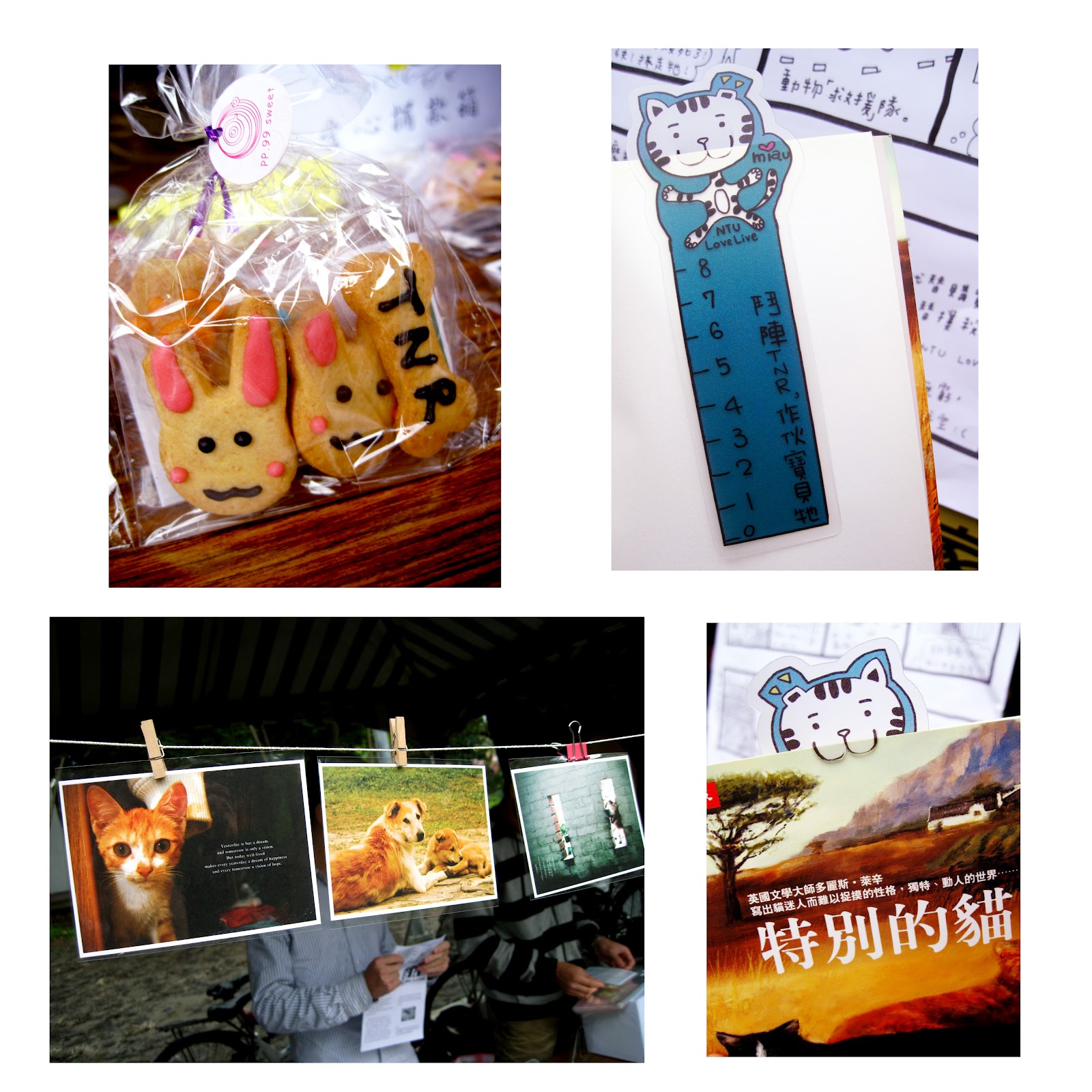 這次義賣的商品非常豐富,有懷生社同學自行拍攝、製作的貓狗明信片三款:最受歡迎的小橘子喵、河濱母子犬與侯硐狗,特殊設計的剪耳貓書籤尺有可以夾住書頁的貓嘴,上頭還印上了充滿鄉土味的TNR小標語,很受小孩喜愛。另外還有一項超級熱銷商品:動物手工餅乾。有剪耳兔造型、貓掌以及寫著TNR的狗骨頭餅乾,一擺出來不到半天即銷售一空。俏皮可愛的糖霜餅乾除了可讓人一飽口福之外,剪耳的造型更激發大家的好奇心,讓大家更有興趣了解TNR。